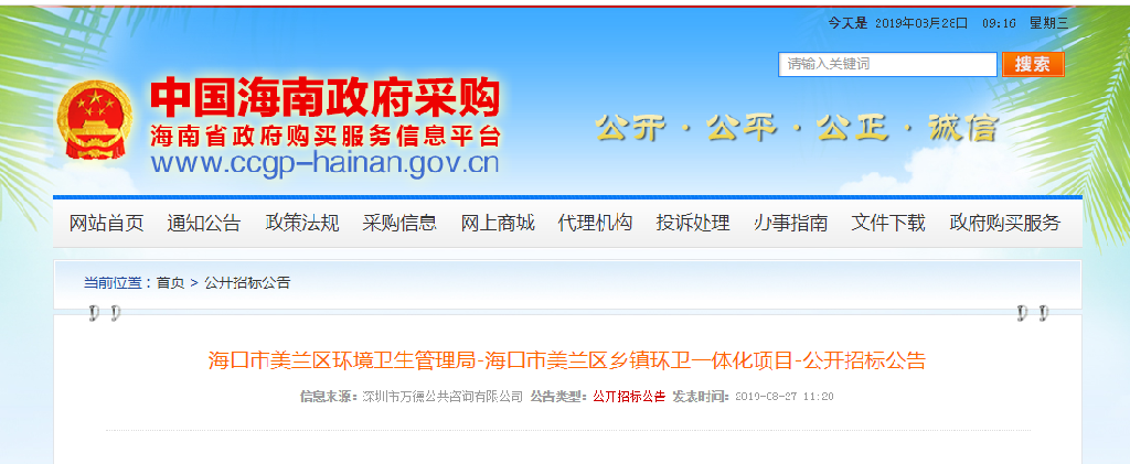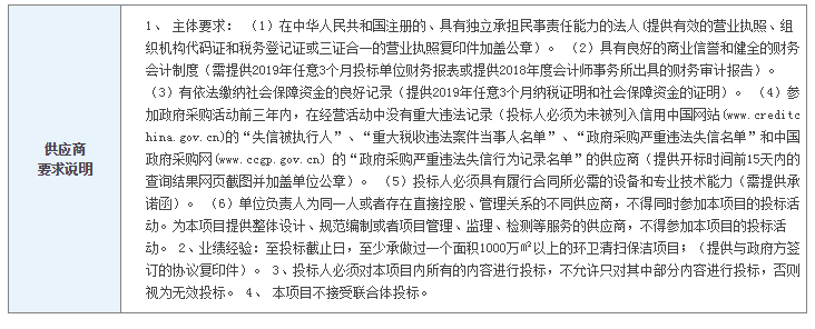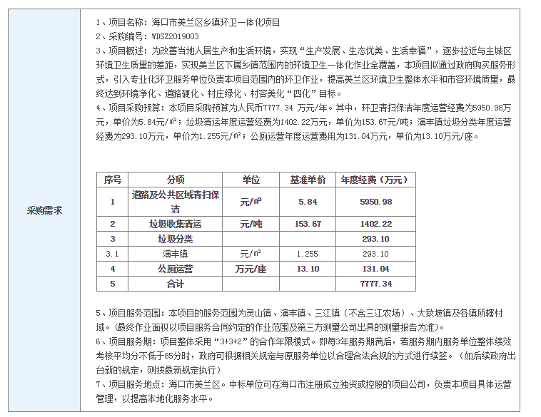 發表時間(jian):2019-08-28 09:47來源:中國海南政府采購網 8月27日,海(hai)南省海口市美(mei)蘭(lan)區鄉鎮環(huan)衛一(yi)體化(hua)項目公開招標,項目采(cai)購預算(suan)人民幣為(wei)7777.34萬元/年,整體(ti)采用(yong)“3+3+2”的合作模(mo)式,期限內項目(mu)總金額(e)達6.22億元,具體招標內容如下: 一、招標項(xiang)目 二、采(cai)購項目(mu)需(xu)要落實(shi)的政(zheng)府采(cai)購政(zheng)策 三、采購需求 四(si)、供應商(shang)要求(qiu)說(shuo)明 五、獲(huo)取招(zhao)標文件時間地點 六、投標截至(zhi)時(shi)間(jian)、開標時(shi)間(jian)及地(di)點(dian) 七(qi)、聯系方(fang)式 上一篇(pian)黑科技!害怕垃圾類型分錯?5G+VR、AI幫你提升技能