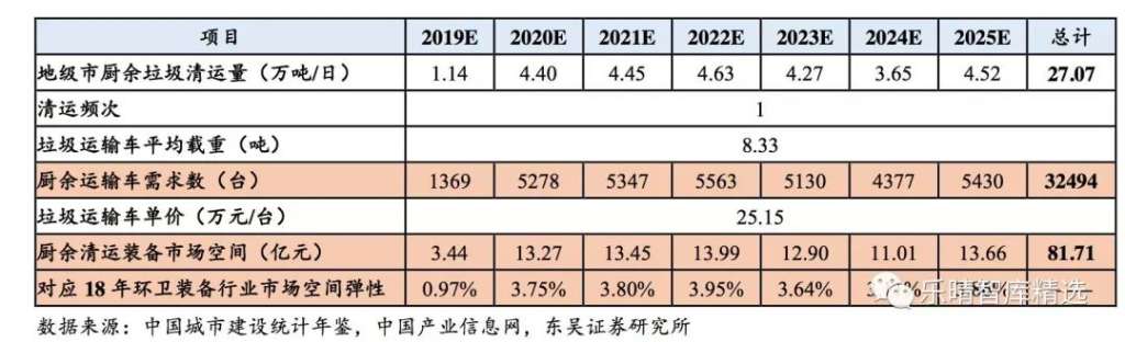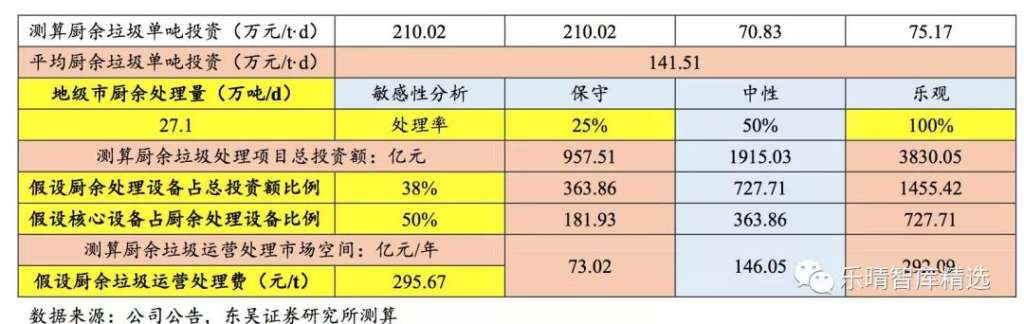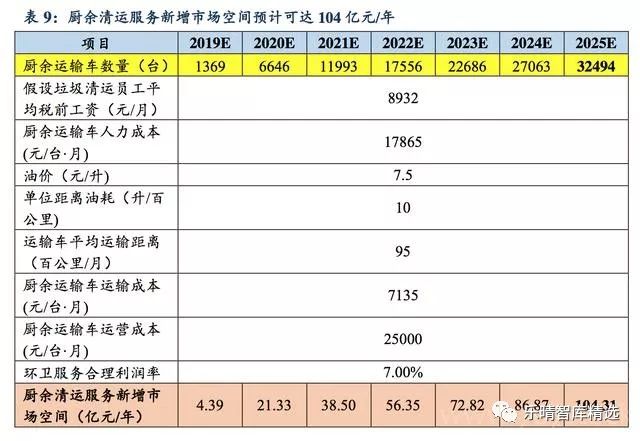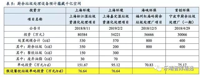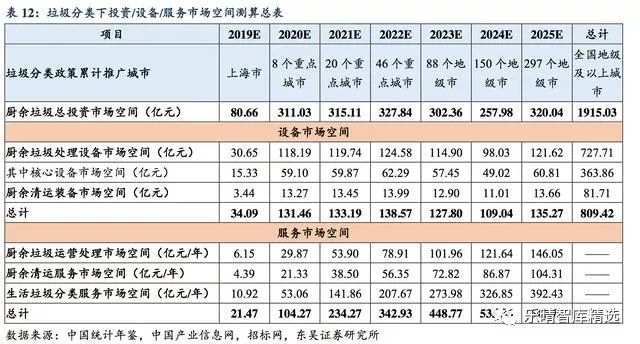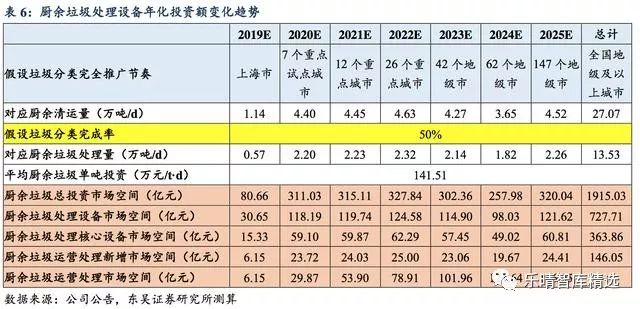 發(fa)表時(shi)間(jian):2019-09-10 10:13來源:東吳證券(quan) 生活(huo)垃圾實施四分類(lei),采(cai)取(qu)分類(lei)投放/回收(shou)/運輸/處置(zhi)路(lu)徑。垃圾(ji)分類政策主要(yao)將(jiang)生活(huo)垃(la)(la)圾(ji)(ji)(ji)(ji)分(fen)(fen)為可回收物(wu)、有(you)害垃(la)(la)圾(ji)(ji)(ji)(ji)、濕垃(la)(la)圾(ji)(ji)(ji)(ji)、干垃(la)(la)圾(ji)(ji)(ji)(ji)等四類(lei),在垃(la)(la)圾(ji)(ji)(ji)(ji)分(fen)(fen)類(lei)政策推行之前我國可回收垃(la)(la)圾(ji)(ji)(ji)(ji)回收率(lv)已(yi)達(da)到較高的水平,所(suo)以此(ci)輪(lun)垃(la)(la)圾(ji)(ji)(ji)(ji)分(fen)(fen)類(lei)的特點主要(yao)是將(jiang)濕垃(la)(la)圾(ji)(ji)(ji)(ji)及有(you)害垃(la)(la)圾(ji)(ji)(ji)(ji)從生活(huo)垃(la)(la)圾(ji)(ji)(ji)(ji)中(zhong)單獨(du)分(fen)(fen)離(li),考慮到有(you)害垃(la)(la)圾(ji)(ji)(ji)(ji)在生活(huo)垃(la)(la)圾(ji)(ji)(ji)(ji)中(zhong)占比很少,因此(ci)我們的垃(la)圾分類(lei)產業(ye)鏈投(tou)資測(ce)算主要針對濕垃(la)圾帶來的市場(chang)增量(liang)空間。垃(la)圾(ji)(ji)分類(lei)產業鏈包括上游的投放、收運和下游的處理(li)處置,垃(la)圾(ji)(ji)分類(lei)后四(si)類(lei)生活垃(la)圾(ji)(ji)將采取分類(lei)投放-分類(lei)回收-分類(lei)運輸-分類(lei)處置路徑。垃(la)圾分類年化市場釋(shi)放節奏依(yi)據城(cheng)市(shi)已有(you)政策(ce)及垃圾(ji)(ji)清運量等屬性推測垃圾(ji)(ji)分(fen)類推進(jin)進(jin)度。2019年(nian)6月(yue)住建(jian)部、發(fa)改委、生(sheng)態環境部等九部門聯合印發(fa)《關(guan)于在(zai)全國(guo)地(di)級及以(yi)(yi)上城(cheng)市(shi)全面開展生(sheng)活(huo)垃圾(ji)(ji)分(fen)類工作(zuo)的通知(zhi)》指出(chu),到(dao)(dao)2020年(nian),46個重點城(cheng)市(shi)基(ji)本(ben)(ben)建(jian)成(cheng)(cheng)生(sheng)活(huo)垃圾(ji)(ji)分(fen)類處(chu)理系統(tong)(tong);到(dao)(dao)2025年(nian),全國(guo)地(di)級及以(yi)(yi)上城(cheng)市(shi)基(ji)本(ben)(ben)建(jian)成(cheng)(cheng)生(sheng)活(huo)垃圾(ji)(ji)分(fen)類處(chu)理系統(tong)(tong)。我們依據各城市(shi)已推行的(de)垃(la)圾分(fen)類(lei)(lei)政策(ce)及各城市(shi)生(sheng)活垃(la)圾清運量及處置規模等屬(shu)性推測垃(la)圾分(fen)類(lei)(lei)政策(ce)推行進度。考慮到政策實際推行情況,保(bao)守(shou)假設垃圾分類年(nian)(nian)化市(shi)(shi)場(chang)釋放(fang)節奏為(wei):2019年(nian)(nian)上海;2020年(nian)(nian)北京/南京/成都/深圳等7個(ge)(ge)重點(dian)(dian)城(cheng)市(shi)(shi);21年(nian)(nian)重慶/天津/蘇州(zhou)等12個(ge)(ge)重點(dian)(dian)城(cheng)市(shi)(shi);22年(nian)(nian)46個(ge)(ge)重點(dian)(dian)城(cheng)市(shi)(shi)中剩(sheng)(sheng)余的(de)(de)(de)26個(ge)(ge)重點(dian)(dian)城(cheng)市(shi)(shi);23年(nian)(nian)保(bao)定/大(da)同/吉林等42個(ge)(ge)地(di)級(ji)市(shi)(shi);24年(nian)(nian)邢臺/淮安/九江等62個(ge)(ge)地(di)級(ji)市(shi)(shi);25年(nian)(nian)剩(sheng)(sheng)余的(de)(de)(de)地(di)級(ji)市(shi)(shi)。在(zai)接(jie)下(xia)來的(de)(de)(de)空(kong)間測算中均以該推廣節奏為(wei)前提進行測算。垃圾分(fen)類(lei)產業(ye)鏈:廚余處(chu)理空間(jian)廣闊據(ju)《中(zhong)國(guo)城(cheng)(cheng)市建設統(tong)計年(nian)鑒2017》數據(ju),2017年(nian)全國(guo)地級及以上城(cheng)(cheng)市生(sheng)(sheng)活垃(la)圾(ji)清運(yun)量(liang)為1.76億噸/年(nian),為全國(guo)城(cheng)(cheng)市垃(la)圾(ji)清運(yun)量(liang)的81.97%。采用(yong)中(zhong)國(guo)再生(sheng)(sheng)資源(yuan)回(hui)收利用(yong)協會數據(ju),假設廚(chu)余(yu)垃(la)圾(ji)占(zhan)生(sheng)(sheng)活垃(la)圾(ji)的比重為56%,則估計全國(guo)地級及以上城(cheng)(cheng)市廚(chu)余(yu)垃(la)圾(ji)清運(yun)量(liang)為27.07萬噸/日。廚余垃圾(ji)投資(zi)市(shi)場蘊藏千億空間。以(yi)100個(ge)餐(can)廚垃圾(ji)試(shi)點城市(shi)的(de)平(ping)均餐(can)廚垃圾(ji)項(xiang)目單噸投資(zi)額76.6萬元(yuan)/天、處理費197元(yuan)作為合(he)理估計值,可得上海環(huan)境松江、上海環(huan)境嘉定、海峽環(huan)保福州(zhou)、首創(chuang)環(huan)保寧波(一(yi)期)4個(ge)項(xiang)目的(de)平(ping)均廚余垃圾(ji)單噸投資(zi)額為141.5(萬元(yuan)/t·d)。考(kao)慮到(dao)廚(chu)余(yu)垃圾含水量(liang)較高,假設(she)廚(chu)余(yu)垃圾處理(li)費是餐(can)廚(chu)垃圾的(de)1.5倍為(wei)(wei)(wei)295.7(元//t·d),以(yi)地級及以(yi)上城(cheng)市平均每(mei)天(tian)產生約27萬噸廚(chu)余(yu)垃圾測算(suan),在中性情景下(即(ji)垃圾分類完(wan)成率為(wei)(wei)(wei)50%),廚(chu)余(yu)垃圾總(zong)投資(zi)額市場空(kong)間(jian)為(wei)(wei)(wei)1915億(yi);按廚(chu)余(yu)垃圾處理(li)設(she)備占(zhan)總(zong)投資(zi)額的(de)38%計(ji)算(suan),對應市場空(kong)間(jian)為(wei)(wei)(wei)728億(yi);按核心設(she)備占(zhan)廚(chu)余(yu)處理(li)設(she)備的(de)50%計(ji)算(suan),對應市場空(kong)間(jian)為(wei)(wei)(wei)364億(yi);廚(chu)余(yu)垃圾運(yun)營處理(li)市場的(de)空(kong)間(jian)為(wei)(wei)(wei)146億(yi)/年,市場空(kong)間(jian)廣闊。廚(chu)余垃圾(ji)(ji)(ji)投(tou)資(zi)(zi)需求(qiu)于2020年(nian)(nian)(nian)(nian)集中(zhong)釋放,之后(hou)每(mei)年(nian)(nian)(nian)(nian)呈穩(wen)(wen)定(ding)趨勢(shi)。廚(chu)余垃圾(ji)(ji)(ji)投(tou)資(zi)(zi)需求(qiu)于2020年(nian)(nian)(nian)(nian)同比增長(chang)385.59%,此(ci)后(hou)保(bao)持穩(wen)(wen)定(ding),其中(zhong)廚(chu)余垃圾(ji)(ji)(ji)總投(tou)資(zi)(zi)市場(chang)(chang)空間每(mei)年(nian)(nian)(nian)(nian)穩(wen)(wen)定(ding)在(zai)(z