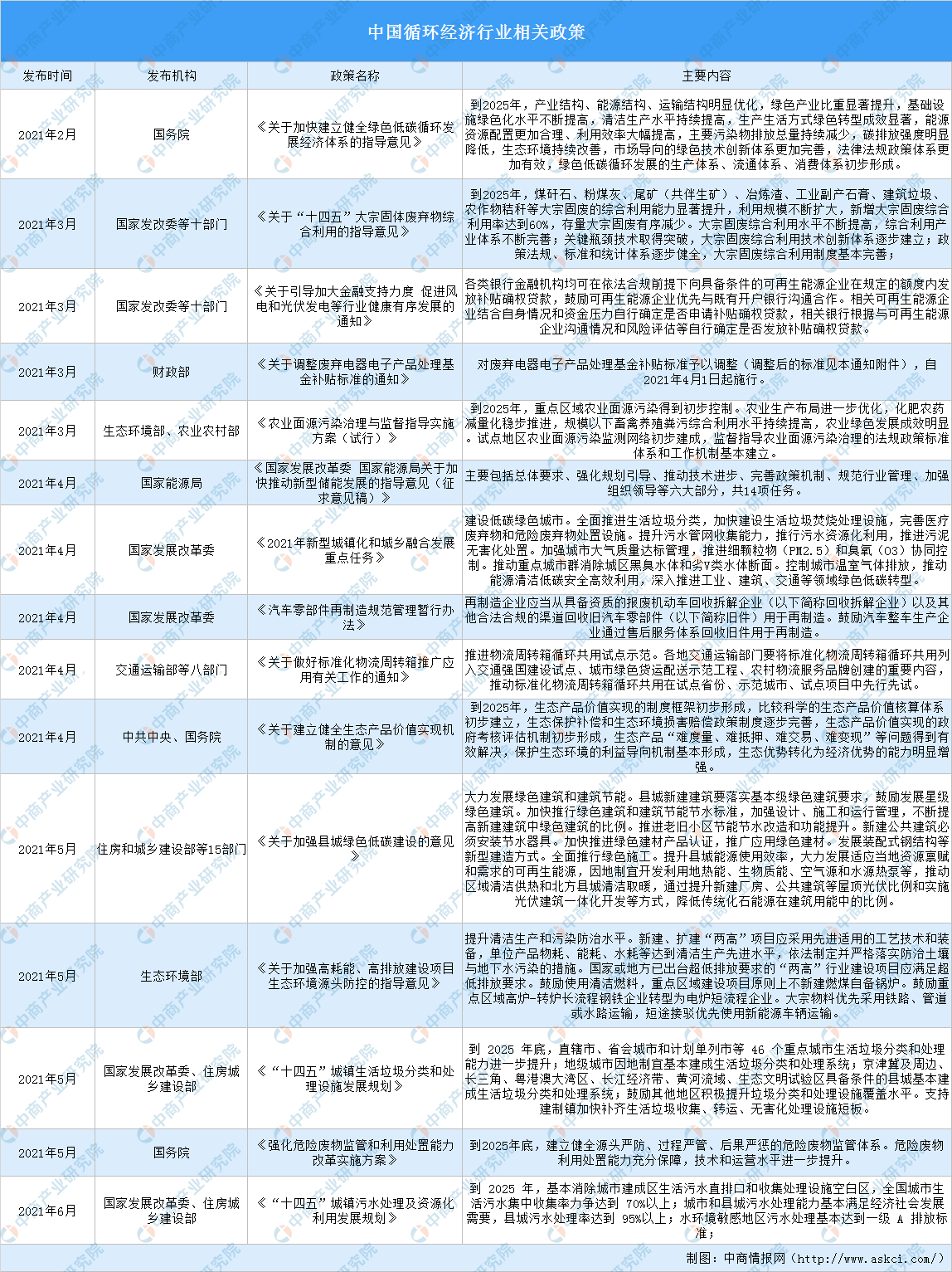 發表時間:2021-06-30 10:37來源(yuan):中商產業研究院 循環(huan)經(jing)濟(ji)(ji)是(shi)以資(zi)源節(jie)約和(he)循環(huan)利用(yong)為特(te)征、與(yu)環(huan)境和(he)諧(xie)的經(jing)濟(ji)(ji)發展模式。循環(huan)經(jing)濟(ji)(ji)強調把(ba)經(jing)濟(ji)(ji)活動組織成一個“資(zi)源一產品_再生資(zi)源”的反饋式流程,其特(te)征是(shi)低開(kai)采、高(gao)利用(yong)、低排放。“十(shi)四五”時期循環(huan)經(jing)濟(ji)(ji)是(shi)實(shi)現2030“碳達峰(feng)”目標和(he)2060“碳中和(he)”愿景的重要途徑,對此(ci)中國十(shi)四五規劃綱要提出,全面推(tui)行循環(huan)經(jing)濟(ji)(ji)理念(nian),構建(jian)多層次資(zi)源高(gao)效循環(huan)利用(yong)體(ti)系。 一、循環經濟產業發展(zhan)現狀 1、政(zheng)策支持(chi)循環經濟發展 堅持(chi)(chi)綠(lv)色(se)發(fa)(fa)展(zhan)(zhan)是發(fa)(fa)展(zhan)(zhan)觀的(de)一(yi)場深刻(ke)革命,綠(lv)色(se)發(fa)(fa)展(zhan)(zhan)、循(xun)(xun)(xun)環(huan)(huan)發(fa)(fa)展(zhan)(zhan)、低(di)(di)碳(tan)(tan)發(fa)(fa)展(zhan)(zhan)相(xiang)互關(guan)聯、相(xiang)互促進、相(xiang)互協同,核心(xin)是加快生產(chan)(chan)方(fang)式和生活(huo)方(fang)式的(de)綠(lv)色(se)轉(zhuan)型。為支持(chi)(chi)循(xun)(xun)(xun)環(huan)(huan)經濟(ji)發(fa)(fa)展(zhan)(zhan),中國出臺了一(yi)系(xi)(xi)列鼓勵(li)政策(ce)。2021年2月,國務院(yuan)印發(fa)(fa)《關(guan)于加快建(jian)立健全(quan)綠(lv)色(se)低(di)(di)碳(tan)(tan)循(xun)(xun)(xun)環(huan)(huan)發(fa)(fa)展(zhan)(zhan)經濟(ji)體(ti)系(xi)(xi)的(de)指導(dao)意見》,要求到2025年,產(chan)(chan)業結(jie)構(gou)、能源結(jie)構(gou)、運輸結(jie)構(gou)明(ming)顯優化,綠(lv)色(se)產(chan)(chan)業比重顯著提(ti)升,基(ji)礎設施綠(lv)色(se)化水平不斷提(ti)高(gao),清潔生產(chan)(chan)水平持(chi)(chi)續提(ti)高(gao),生產(chan)(chan)生活(huo)方(fang)式綠(lv)色(se)轉(zhuan)型成效顯著,能源資(zi)源配(pei)置(zhi)更加合理、利用(yong)效率大幅提(ti)高(gao),主要污染(ran)物排放總量持(chi)(chi)續減少,碳(tan)(tan)排放強度明(ming)顯降低(di)(di),生態環(huan)(huan)境持(chi)(chi)續改善,市場導(dao)向的(de)綠(lv)色(se)技術(shu)創新體(ti)系(xi)(xi)更加完善,法(fa)律法(fa)規政策(ce)體(ti)系(xi)(xi)更加有效,綠(lv)色(se)低(di)(di)碳(tan)(tan)循(xun)(xun)(xun)環(huan)(huan)發(fa)(fa)展(zhan)(zhan)的(de)生產(chan)(chan)體(ti)系(xi)(xi)、流(liu)通體(ti)系(xi)(xi)、消費體(ti)系(xi)(xi)初步形成。 此外,在碳中和的(de)時代背景下,制造(zao)業正不(bu)斷尋求(qiu)更(geng)清潔、更(geng)高效(xiao)、更(geng)經(jing)(jing)濟(ji)(ji)的(de)能源與制造(zao)方式,而這將(jiang)(jiang)促使(shi)價值重(zhong)估(gu)、產業重(zhong)構,進一步(bu)推(tui)動技術創(chuang)新,繼而推(tui)動社(she)會經(jing)(jing)濟(ji)(ji)發(fa)展(zhan)從(cong)資源依賴(lai)型走(zou)向(xiang)技術依賴(lai)型。預計(ji)國家將(jiang)(jiang)出臺(tai)更(geng)多循環經(jing)(jing)濟(ji)(ji)鼓(gu)勵政策,循環經(jing)(jing)濟(ji)(ji)有(you)望(wang)迎來(lai)長期發(fa)展(zhan)機遇。 資料來源:中(zhong)商產業研(yan)究院整理 2、節能環保產業(ye)快速發展 節能環(huan)(huan)保(bao)產(chan)(chan)業是指為(wei)節約(yue)能源資(zi)源、發展(zhan)循環(huan)(huan)經(jing)濟、保(bao)護生(sheng)態環(huan)(huan)境提(ti)供(gong)物質基礎和(he)技(ji)術保(bao)障的產(chan)(chan)業,是國家加(jia)快培育和(he)發展(zhan)的7個(ge)戰略性新(xin)興產(chan)(chan)業之(zhi)一。節能環(huan)(huan)保(bao)產(chan)(chan)業涉及節能環(huan)(huan)保(bao)技(ji)術裝(zhuang)備(bei)、產(chan)(chan)品和(he)服務等,產(chan)(chan)業鏈長,關聯度大,吸(xi)納就業能力強,對經(jing)濟增長拉動作用明顯(xian)。 “十三五”期(qi)間,我(wo)國(guo)(guo)資源(yuan)節約和環(huan)境(jing)保(bao)(bao)護工作成(cheng)效顯著,綠色產(chan)(chan)業(ye)發展(zhan)勢頭良好,我(wo)國(guo)(guo)節能(neng)環(huan)保(bao)(bao)產(chan)(chan)業(ye)快速發展(zhan)。數據顯示,我(wo)國(guo)(guo)節能(neng)環(huan)保(bao)(bao)產(chan)(chan)業(ye)產(chan)(chan)值由2015年的4.5萬億(yi)元(yuan)(yuan)上升到2020年的7.5萬億(yi)元(yuan)(yuan)左右。中商(shang)產(chan)(chan)業(ye)研究院預計,2021年我(wo)國(guo)(guo)節能(neng)環(huan)保(bao)(bao)產(chan)(chan)業(ye)產(chan)(chan)值將突破8萬億(yi)元(yuan)(yuan)。 數據來源:國家發改委、中商產業研(yan)究(jiu)院整理 3、工業固(gu)廢綜合利用率有(you)待提(ti)升(sheng) 2019年,全(quan)國工業(ye)(ye)固廢(fei)(fei)綜合(he)(he)利用量19.49億噸,同比(bi)增長0.73%,工業(ye)(ye)固體廢(fei)(fei)物的綜合(he)(he)利用率為55.63%。綜合(he)(he)來(lai)看,我國工業(ye)(ye)固體廢(fei)(fei)物的綜合(he)(he)利用率還有明顯的提升空間(jian)。 資料來源(yuan):國家統計(ji)局、中商產業研(yan)究院整理 4、生活垃圾分類市場潛力大 “十三五”時(shi)期,各(ge)地(di)和有(you)關部門深入貫(guan)徹習近平生態(tai)文明(ming)思想,認真落實黨中央、國務院決策部署,加大規劃引導和政策支持力(li)度,穩(wen)步(bu)推(tui)進生活(huo)垃圾分(fen)類(lei),積極開展分(fen)類(lei)投放、分(fen)類(lei)收集、分(fen)類(lei)運(yun)輸和分(fen)類(lei)處理(li)設(she)施建設(she),大力(li)推(tui)行(xing)焚燒處理(li),進一步(bu)健(jian)全收運(yun)體系(xi),推(tui)動生活(huo)垃圾處理(li)能(neng)力(li)顯著提升,處理(li)結構明(ming)顯優化(hua)。 安(an)信證(zheng)(zheng)券有(you)研(yan)究報(