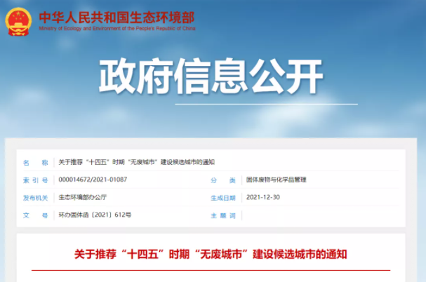 生態環境部:關于推薦“十四五”時期“無廢城市”建設候選城市的通知 二維碼