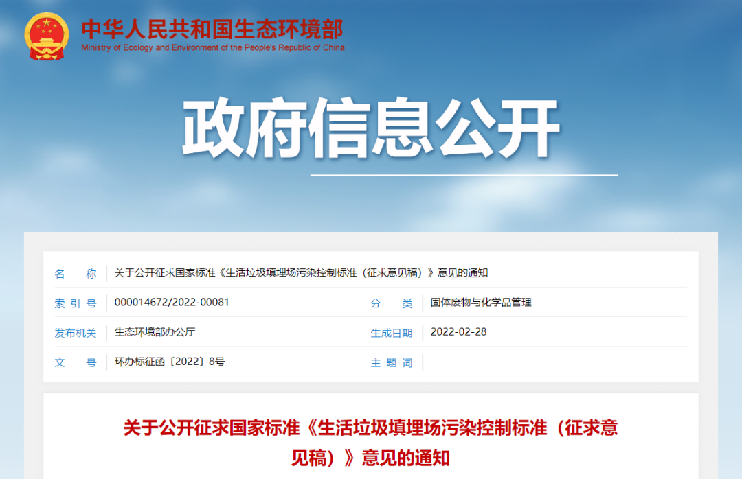 發表(biao)時(shi)間:2022-03-01 09:36來源:生態環境部 日前,生(sheng)態(tai)(tai)環境部發布關于公(gong)(gong)開征(zheng)求國家標(biao)(biao)準《生(sheng)活垃(la)圾填埋場(chang)污染控(kong)制標(biao)(biao)準(征(zheng)求意(yi)見(jian)稿)》意(yi)見(jian)的通知。根據《國家生(sheng)態(tai)(tai)環境標(biao)(biao)準制修訂工作規則》要求,《生(sheng)活垃(la)圾填埋場(chang)污染控(kong)制標(biao)(biao)準(征(zheng)求意(yi)見(jian)稿)》現向(xiang)社會公(gong)(gong)開征(zheng)求意(yi)見(jian),意(yi)見(jian)反饋(kui)截止時(shi)間為2022年(nian)3月31日。 生態環境部辦公廳 2022年(nian)2月(yue)22日 (此件(jian)社會公開) 上(shang)一篇專家解讀|加快推進生活垃圾分類和處理設施建設 推動設施高質量綠色發展