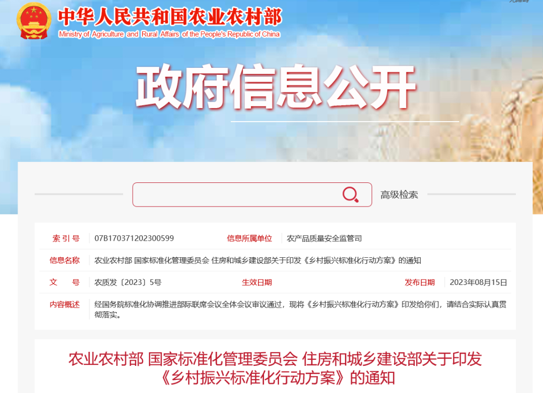 發表時間:2023-08-24 16:15 # 文(wen)章導讀 近日,農業農村部(bu)官網公布《鄉村振(zhen)興標準化行(xing)動方(fang)案》。 HWZS 根據方案,要健全(quan)農(nong)村人居環境(jing)標準(zhun)體系,開(kai)展農(nong)村人居環境(jing)整(zheng)治(zhi)相(xiang)(xiang)關術語(yu)、分類、協同(tong)處(chu)理、環境(jing)評價、綜合治(zhi)理等綜合通(tong)用標準(zhun)的制(zhi)(zhi)修(xiu)訂(ding),穩(wen)步推進(jin)農(nong)村不(bu)同(tong)類型衛生(sheng)廁所、糞污處(chu)理以及相(xiang)(xiang)關配套設(she)(she)施的建設(she)(she)、管護標準(zhun)制(zhi)(zhi)定,推進(jin)農(nong)村廁所革命。 完善(shan)農村(cun)(cun)(cun)(cun)(cun)生活垃圾分類、收(shou)集、轉運、處理和(he)監測評價標(biao)(biao)準(zhun),加快提升(sheng)農村(cun)(cun)(cun)(cun)(cun)生活污水、垃圾治理標(biao)(biao)準(zhun)化(hua)水平。系(xi)統推(tui)進農村(cun)(cun)(cun)(cun)(cun)水系(xi)、村(cun)(cun)(cun)(cun)(cun)莊節水、村(cun)(cun)(cun)(cun)(cun)莊綠化(hua)、村(cun)(cun)(cun)(cun)(cun)莊公(gong)共照(zhao)明、農村(cun)(cun)(cun)(cun)(cun)公(gong)共空間、村(cun)(cun)(cun)(cun)(cun)莊保(bao)潔等(deng)標(biao)(biao)準(zhun)制定,研制鄉村(cun)(cun)(cun)(cun)(cun)風貌引(yin)(yin)導、村(cun)(cun)(cun)(cun)(cun)容(rong)村(cun)(cun)(cun)(cun)(cun)貌提升(sheng)、森林(lin)鄉村(cun)(cun)(cun)(cun)(cun)建設和(he)傳統村(cun)(cun)(cun)(cun)(cun)落保(bao)護利用相關標(biao)(biao)準(zhun),引(yin)(yin)導村(cun)(cun)(cun)(cun)(cun)容(rong)村(cun)(cun)(cun)(cun)(cun)貌提升(sheng)。 鄉村振興(xing)標準(zhun)化行動方(fang)案 為(wei)貫(guan)徹(che)落實《中共中央、國(guo)(guo)務院關于實施鄉(xiang)村(cun)振興戰略的意見》、《國(guo)(guo)家標準(zhun)化發展綱要(yao)》、《“十四(si)五”推(tui)進農(nong)業農(nong)村(cun)現代化規劃》等有關部署,統籌實施鄉(xiang)村(cun)振興標準(zhun)化行動(dong),充分(fen)發揮標準(zhun)化在(zai)推(tui)動(dong)鄉(xiang)村(cun)振興中的支撐作用,制定本行動(dong)方(fang)案(an)。 一(yi)、總體要求 (一)指導思想 以習近平新(xin)時代中國(guo)特色社會(hui)主義思想為(wei)(wei)指導,深入貫(guan)徹黨的二十大(da)、中央(yang)經濟工(gong)作(zuo)會(hui)議和(he)中央(yang)農村工(gong)作(zuo)會(hui)議精(jing)神,全(quan)面落實黨中央(yang)、國(guo)務院(yuan)關于推(tui)(tui)進鄉村振(zhen)興和(he)標準(zhun)化(hua)(hua)工(gong)作(zuo)的重大(da)戰略部署,充分發揮標準(zhun)化(hua)(hua)在全(quan)面推(tui)(tui)進鄉村振(zhen)興中的基礎性和(he)引領性作(zuo)用,健全(quan)標準(zhun)體系,強化(hua)(hua)標準(zhun)實施,構建協同機(ji)制,助力鄉村產業(ye)、人才、文化(hua)(hua)、生態和(he)組織振(zhen)興,為(wei)(wei)全(quan)面推(tui)(tui)進鄉村振(zhen)興、加快(kuai)建設農業(ye)強國(guo)提供標準(zhun)化(hua)(hua)支撐(cheng)。 (二)基本原(yuan)則(ze) 1.堅持(chi)系(xi)統觀念(nian)。堅持(chi)農業農村現代化一體(ti)設計(ji)、一并推進,統籌鄉村生(sheng)(sheng)產(chan)、生(sheng)(sheng)活、生(sheng)(sheng)態各(ge)領域,融合標準(zhun)(zhun)規劃、制定、宣貫和(he)實施(shi)各(ge)階段,充分(fen)(fen)調(diao)動地方、社會團(tuan)體(ti)和(he)企業參與標準(zhun)(zhun)化工(gong)作的積極性,構建(jian)層次清晰、職責(ze)分(fen)(fen)明、功能互補的標準(zhun)(zhun)供給體(ti)系(xi)。 2.堅持分類(lei)指導。立足鄉(xiang)村(cun)產業(ye)發展(zhan)、鄉(xiang)村(cun)建設和鄉(xiang)村(cun)公共服(fu)務標(biao)(biao)(biao)準(zhun)化(hua)的實際需(xu)求,因地制(zhi)宜,精準(zhun)施策,分類(lei)推進各(ge)領域標(biao)(biao)(biao)準(zhun)化(hua)工作,合理(li)確定公共基礎設施配置和公共服(fu)務標(biao)(biao)(biao)準(zhun),著力解決短板弱項,整體提升(sheng)農業(ye)農村(cun)標(biao)(biao)(biao)準(zhun)化(hua)水平。 3.堅(jian)持(chi)創新(xin)引領。以(yi)標準創新(xin)推動新(xin)一(yi)代信(xin)息技(ji)術應用,加快農業(ye)信(xin)息化和鄉(xiang)(xiang)村(cun)數(shu)字化。推進(jin)現(xian)代農業(ye)全(quan)產(chan)業(ye)鏈(lian)(lian)標準化,拓(tuo)展全(quan)鏈(lian)(lian)條(tiao)增值增效空間。創新(xin)標準化推進(jin)機制,探(tan)索(suo)以(yi)標準化支(zhi)撐鄉(xiang)(xiang)村(cun)振興的新(xin)思路、新(xin)路徑、新(xin)方(fang)法(fa)。 4.堅(jian)持開放(fang)共(gong)享(xiang)。深(shen)化國際合作,推動(dong)國內外農(nong)(nong)業農(nong)(nong)村標準(zhun)互(hu)聯互(hu)通,交(jiao)流中國農(nong)(nong)業農(nong)(nong)村標準(zhun)化經驗,貢獻中國標準(zhun)化方案。以標準(zhun)化推動(dong)農(nong)(nong)村共(gong)同富裕(yu),讓廣大農(nong)(nong)民共(gong)享(xiang)發(fa)展(zhan)成果(guo)。 (三)主要(yao)目標 到(dao)2025年,農(nong)業(ye)農(nong)村(cun)高(gao)質量發展標準(zhun)(zhun)(zhun)體(ti)系(xi)基(ji)本(ben)建立,公益(yi)性和(he)市場化相結合的標準(zhun)(zhun)(zhun)化推廣(guang)服(fu)務(wu)體(ti)系(xi)基(ji)本(ben)建成,農(nong)業(ye)農(nong)村(cun)標準(zhun)(zhun)(zhun)的國際化程度顯著(zhu)提(ti)高(gao),標準(zhun)(zhun)(zhun)化協(xie)調推進(jin)機制基(ji)本(ben)形(xing)成,標準(zhun)(zhun)(zhun)化支撐(cheng)和(he)服(fu)務(wu)鄉村(cun)振興的作用日(ri)益(yi)凸(tu)顯。 ——農(nong)業(ye)高質量發展標(biao)準(zhun)體(ti)系(xi)基本(ben)建立。制(zhi)修訂農(nong)業(ye)領域國家和行業(ye)標(biao)準(zhun)1000項,與(yu)國際標(biao)準(zhun)一致性程度顯著提升,構建現代(dai)農(nong)業(ye)全產業(ye)鏈標(biao)準(zhun